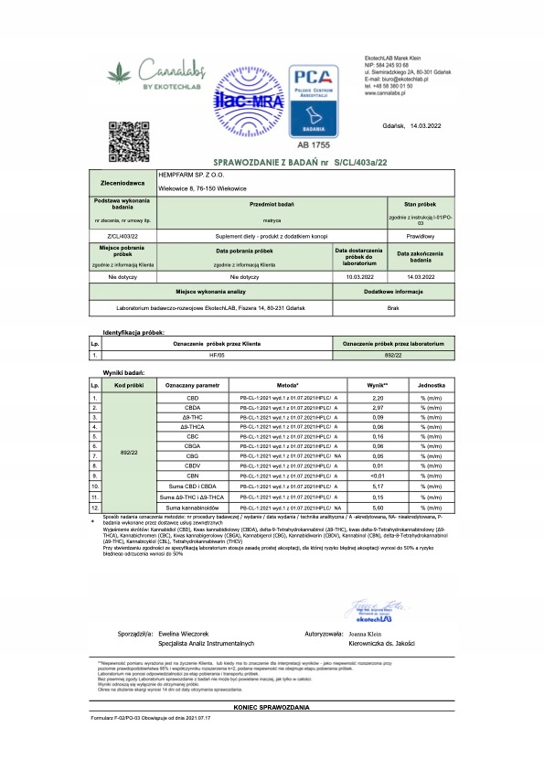 Integracja wszystkich procesów produkcji w jednym miejscu umożliwiła pozyskanie CBD najwyższej jakości - nie z importowanego, krystalicznego izolatu jak to często się zdarza, tylko z ekstrakcji alkoholowej. Precyzja tej metody pozwala na pełne wykorzystanie potencjału rośliny w wyniku czego otrzymujemy produkt najwyższej jakości o pełnym składzie substancji czynnych. Produkty wytwarzane w ten sposób, poza CBD, zawierają pełne spektrum cennych związków, zawartych w konopiach włóknistych, docenianych przez świadomych konsumentów.